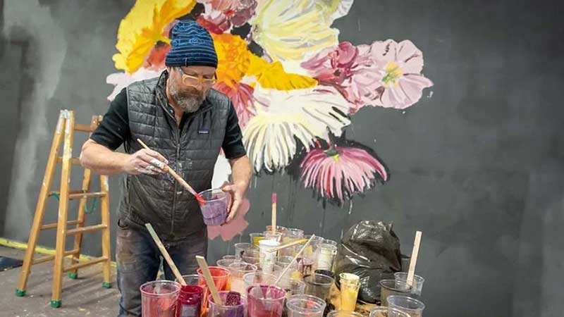 Visuel kunst på hospitaler ses i stigende grad som en sundhedsintervention og ikke kun som udsmykning. Her er det kunstneren Erik A. Frandsen, som udsmykker foyeren, Regionshospitalet Gødstrup. Foto: Søren Braad Andersen
